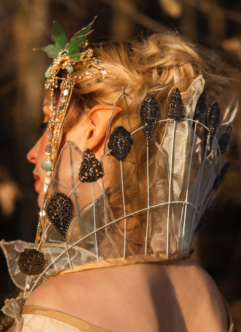 Das Set enthält ein gefüttertes Korsett mit Stäbchen und Rückenschnürung, das eine feminine Silhouette formt. Dazu gehört ein bodenlanger, weit fallender Rock mit Taillenbund sowie transparente Blätterelemente, die dem Design eine elfenhafte Leichtigkeit verleihen. Optional kann ein abnehmbarer Kragen mit Drahtstruktur und dekorativen Schmuckelementen ergänzt werden.
